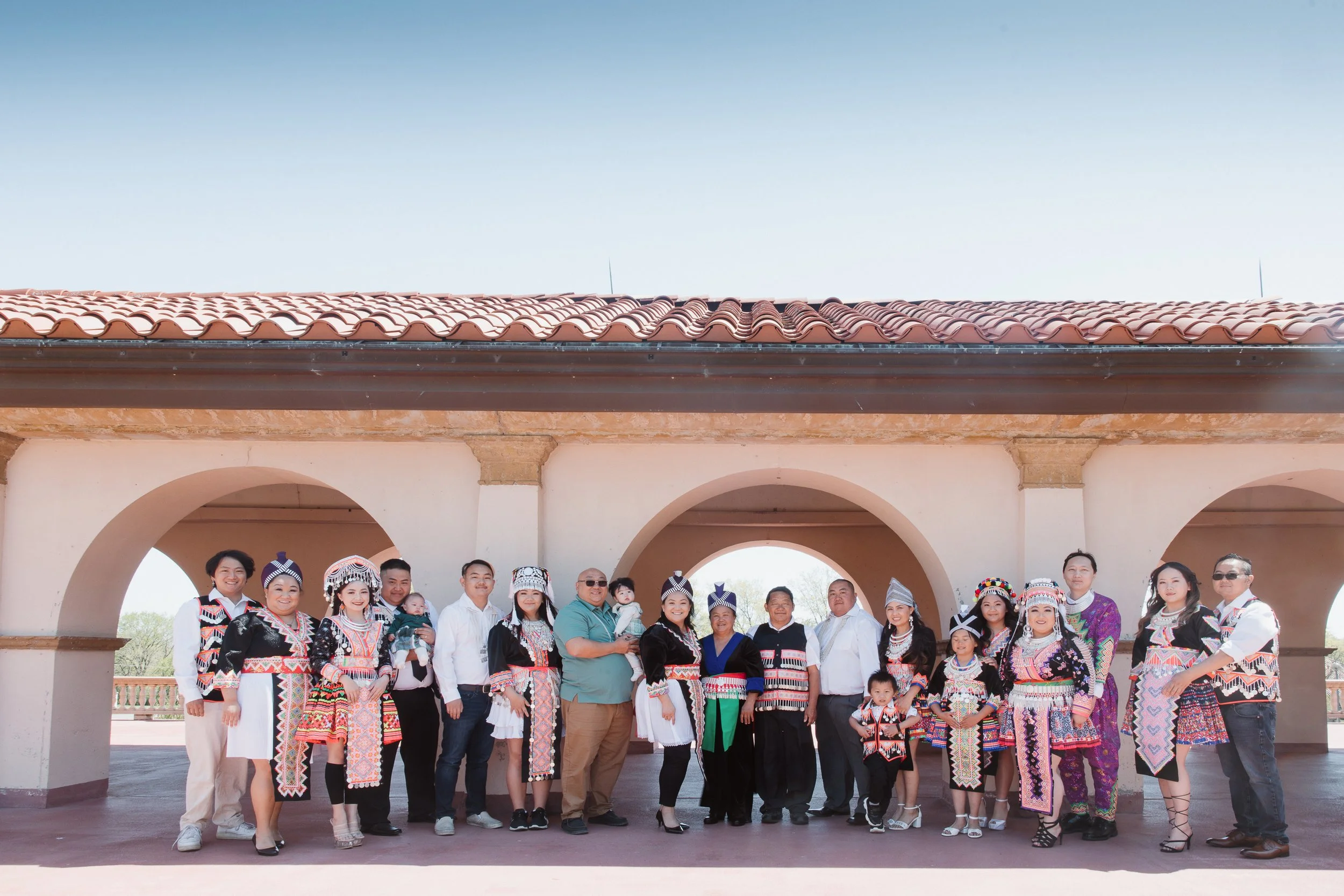 People dressed in traditional clothing standing under a large archway, smiling for the photo.