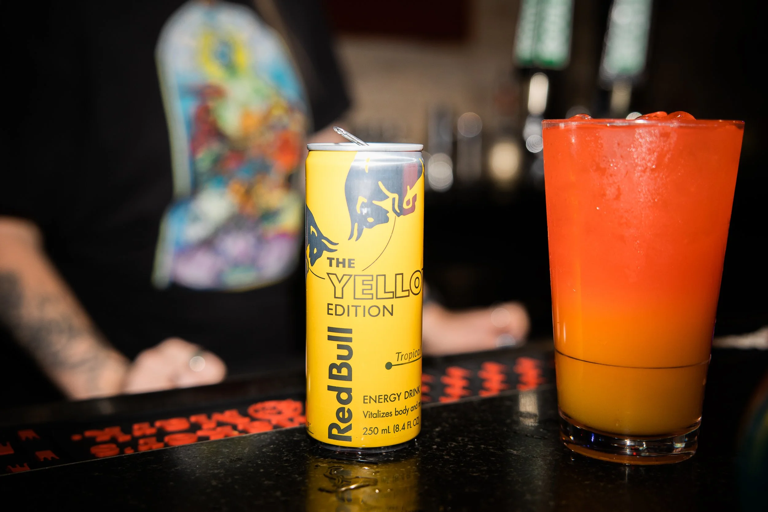 A yellow can of Red Bull energy drink and an orange cocktail in a tall glass sitting on a bar counter. The background is blurred with a person wearing a black shirt with a colorful design.