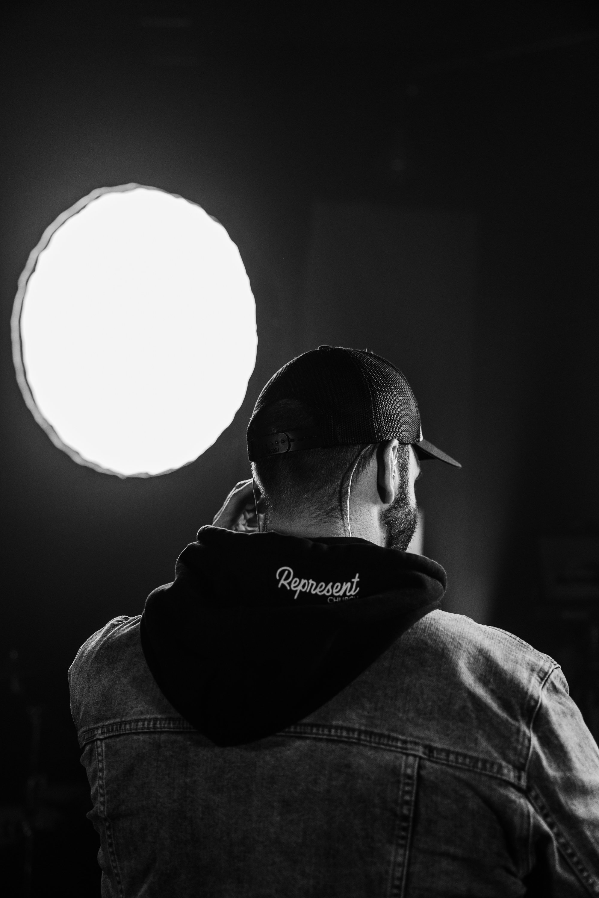 Back view of a man wearing a baseball cap, hoodie, and denim jacket, sitting indoors near a bright circular light source.