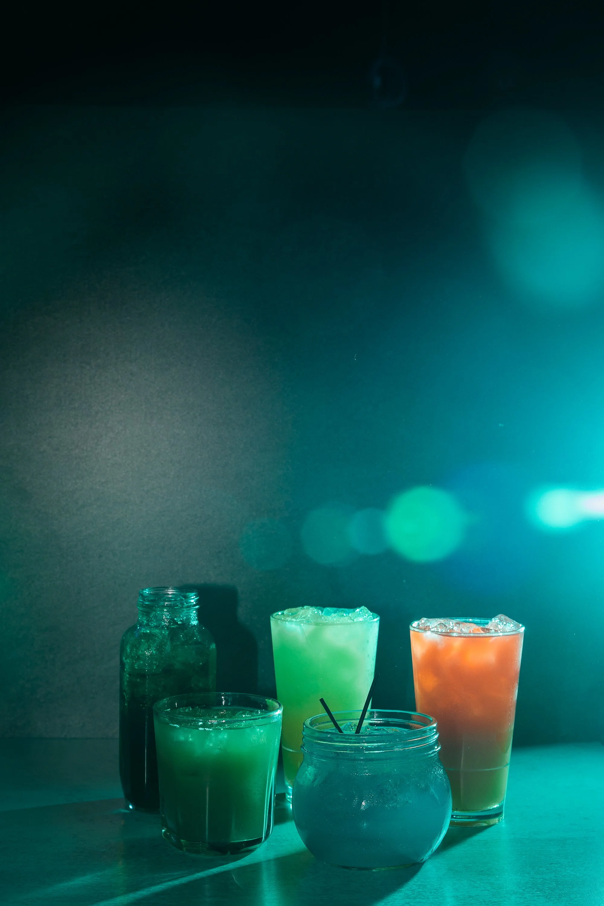 Various colorful drinks in glasses and jars on a dark surface under moody, ambient lighting.